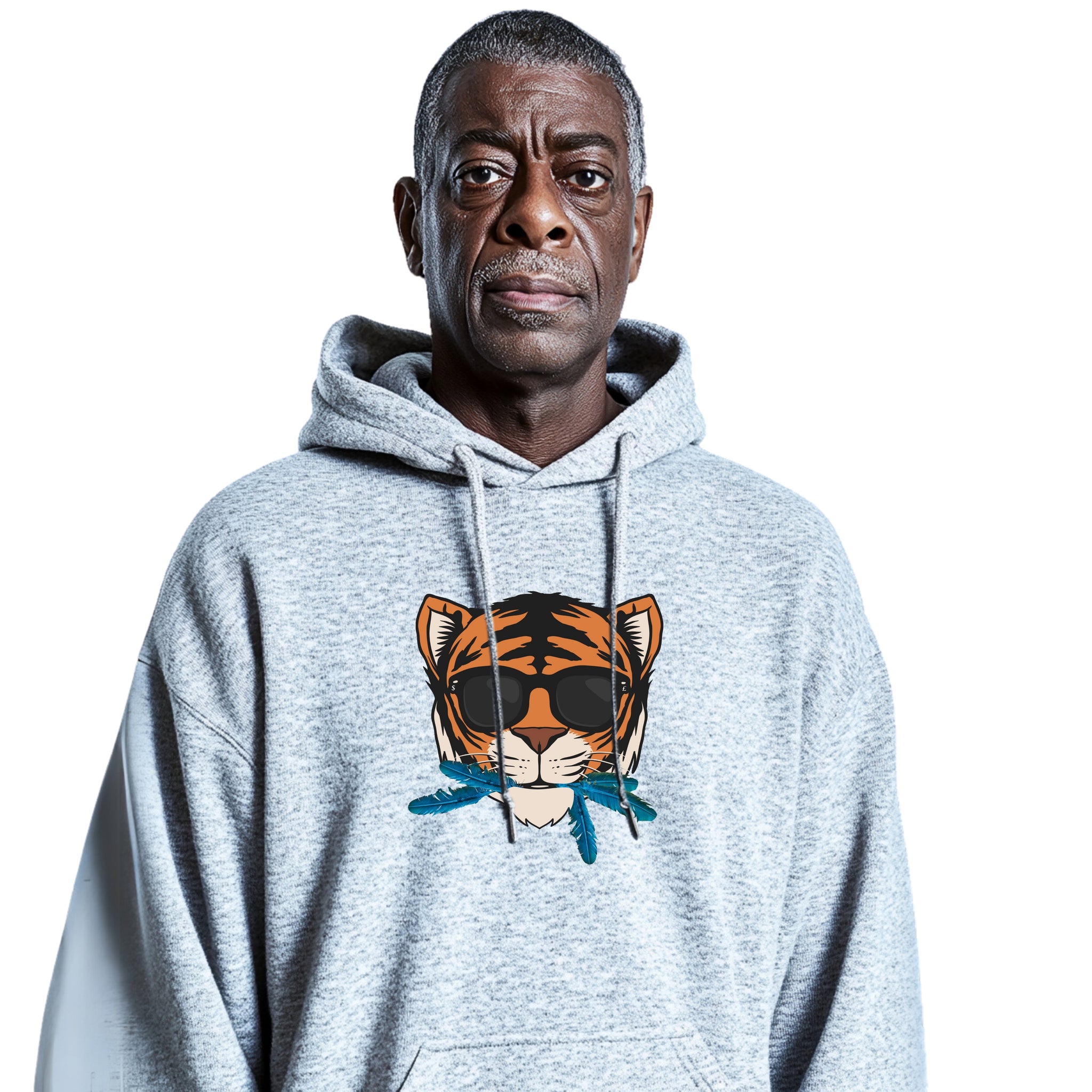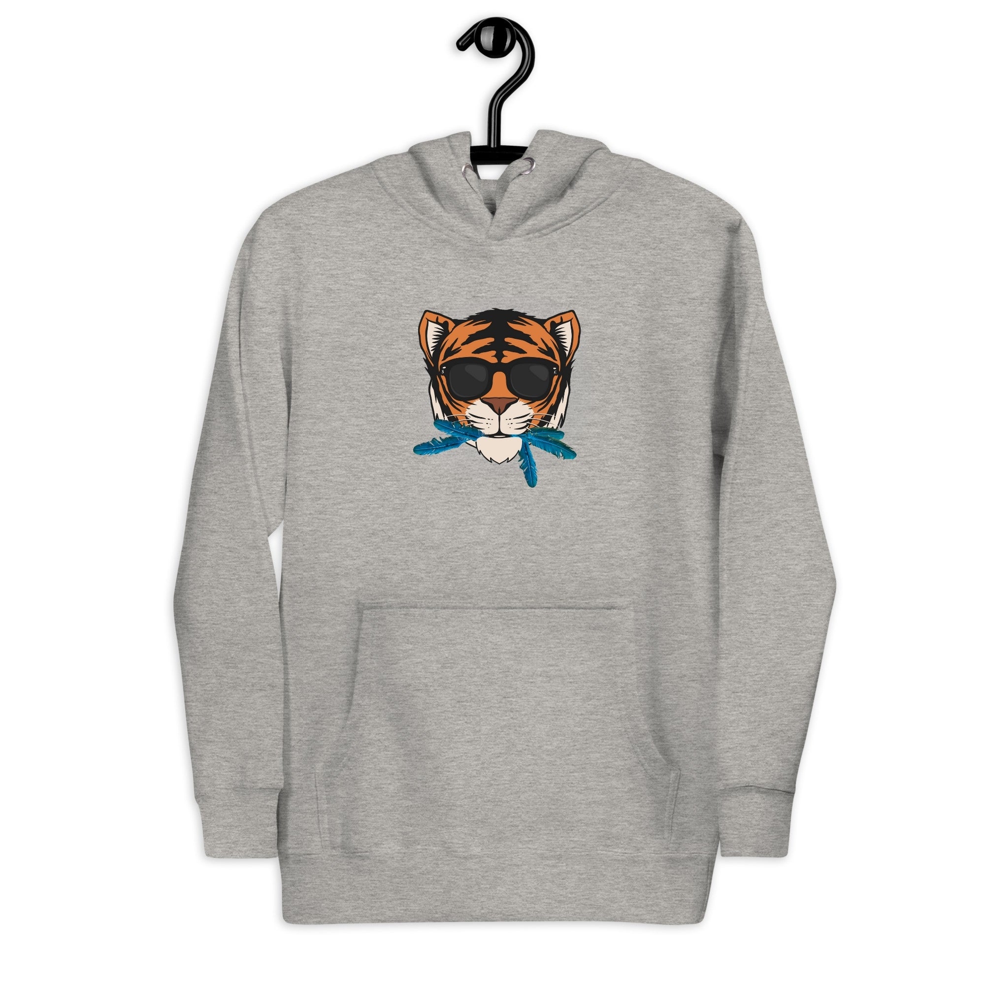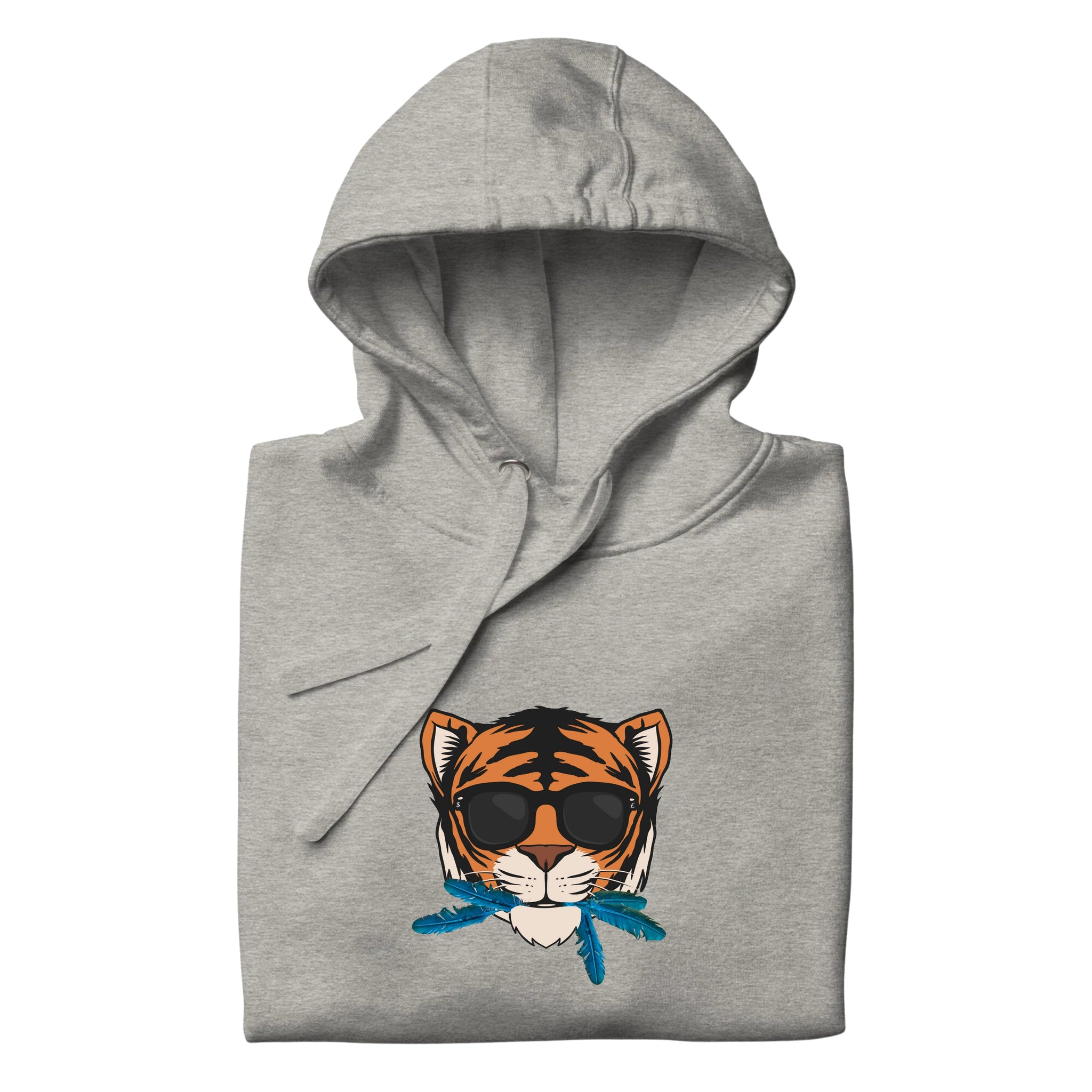 Embrace the essence of quiet confidence with the "Cat That Ate the Canary" Hoodie in versatile gray, featuring a striking centered animated tiger’s face adorned with sleek black shades and vibrant blue canary feathers playfully sticking out of its mouth. This eye-catching design powerfully illustrates the phrase "the cat that ate the canary," symbolizing a profound sense of self-satisfaction and assurance. It encapsulates the notion that true success often speaks for itself, even when one doesn’t feel the need to boast.