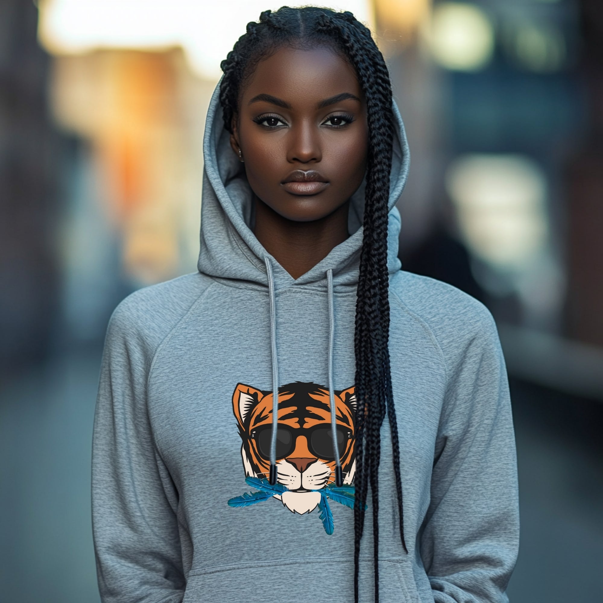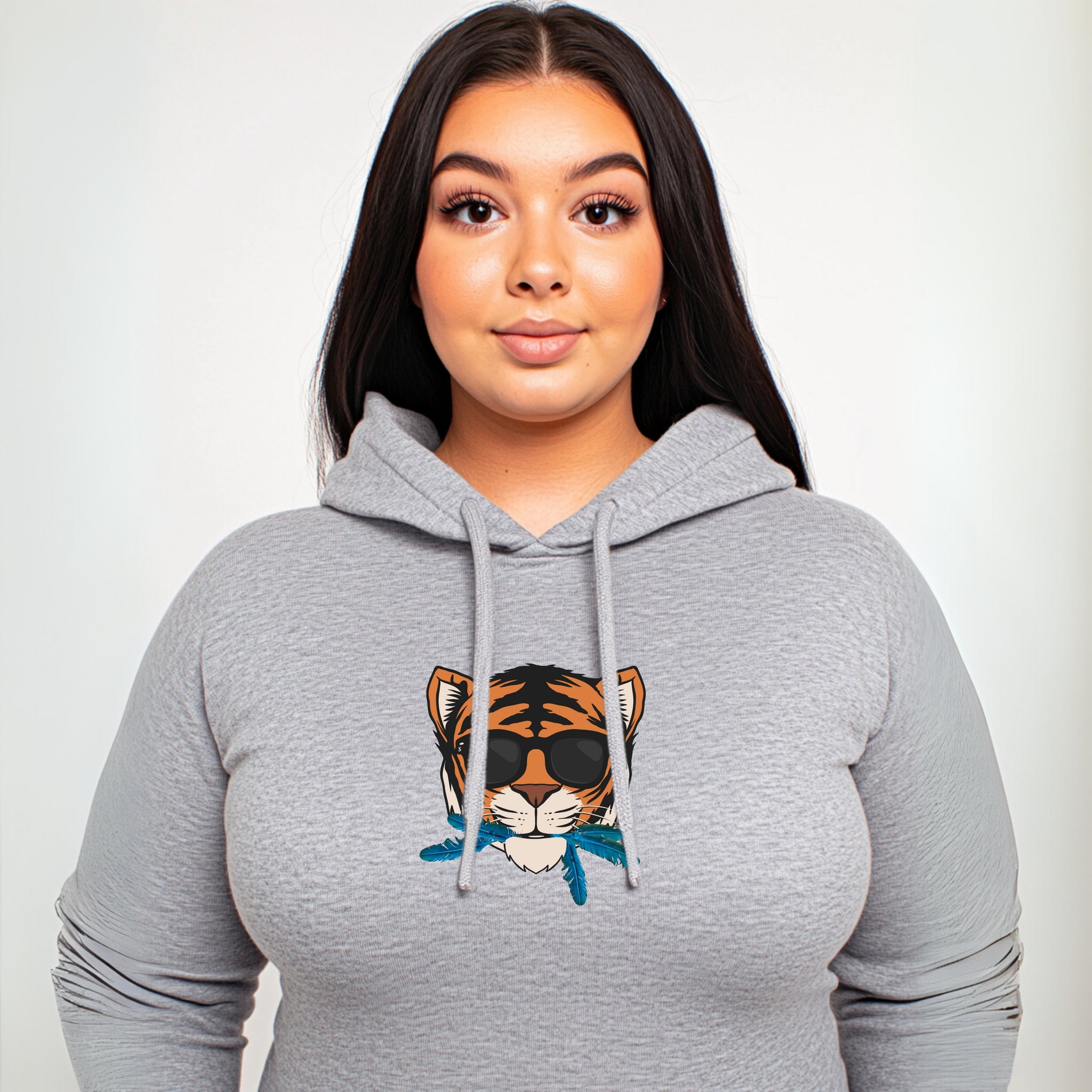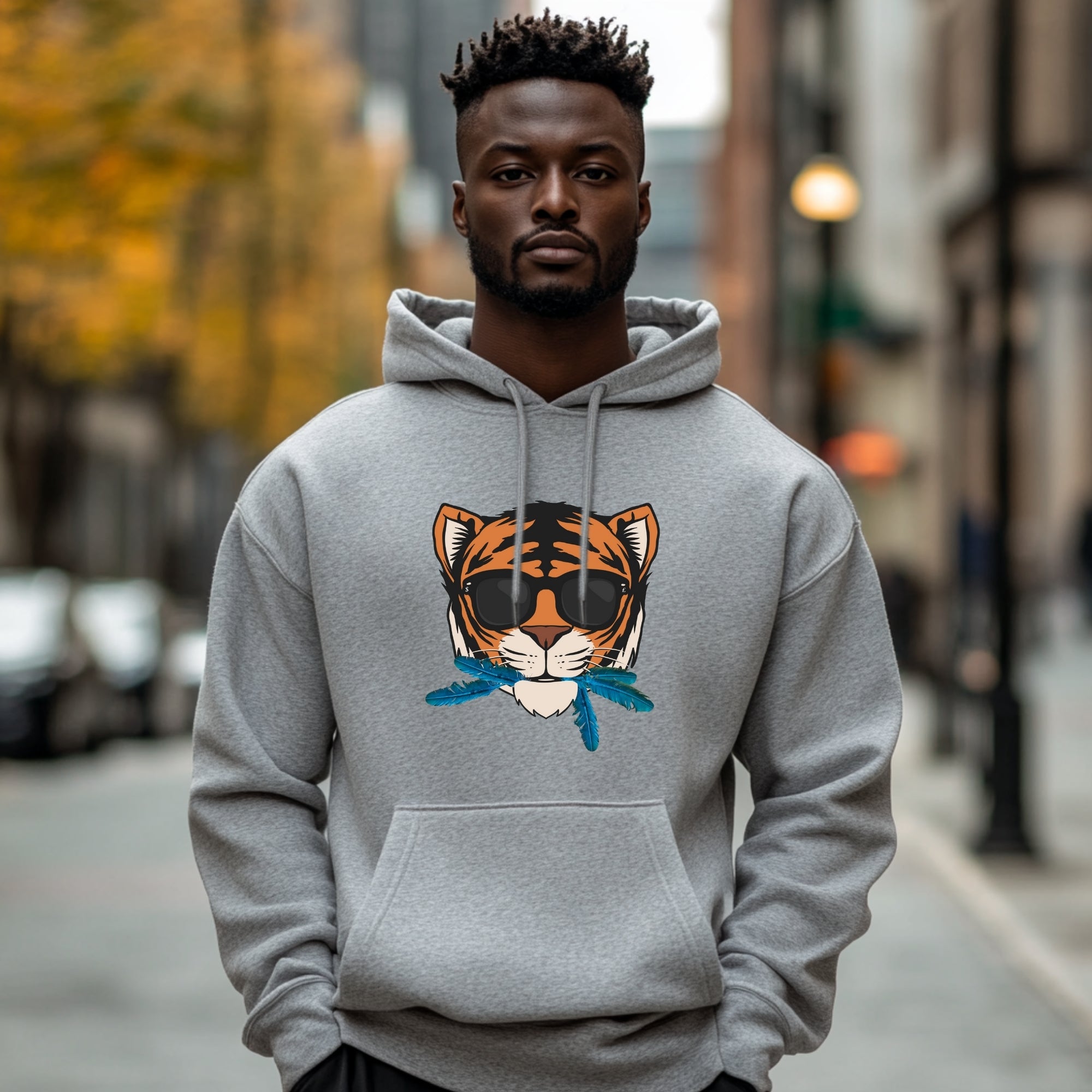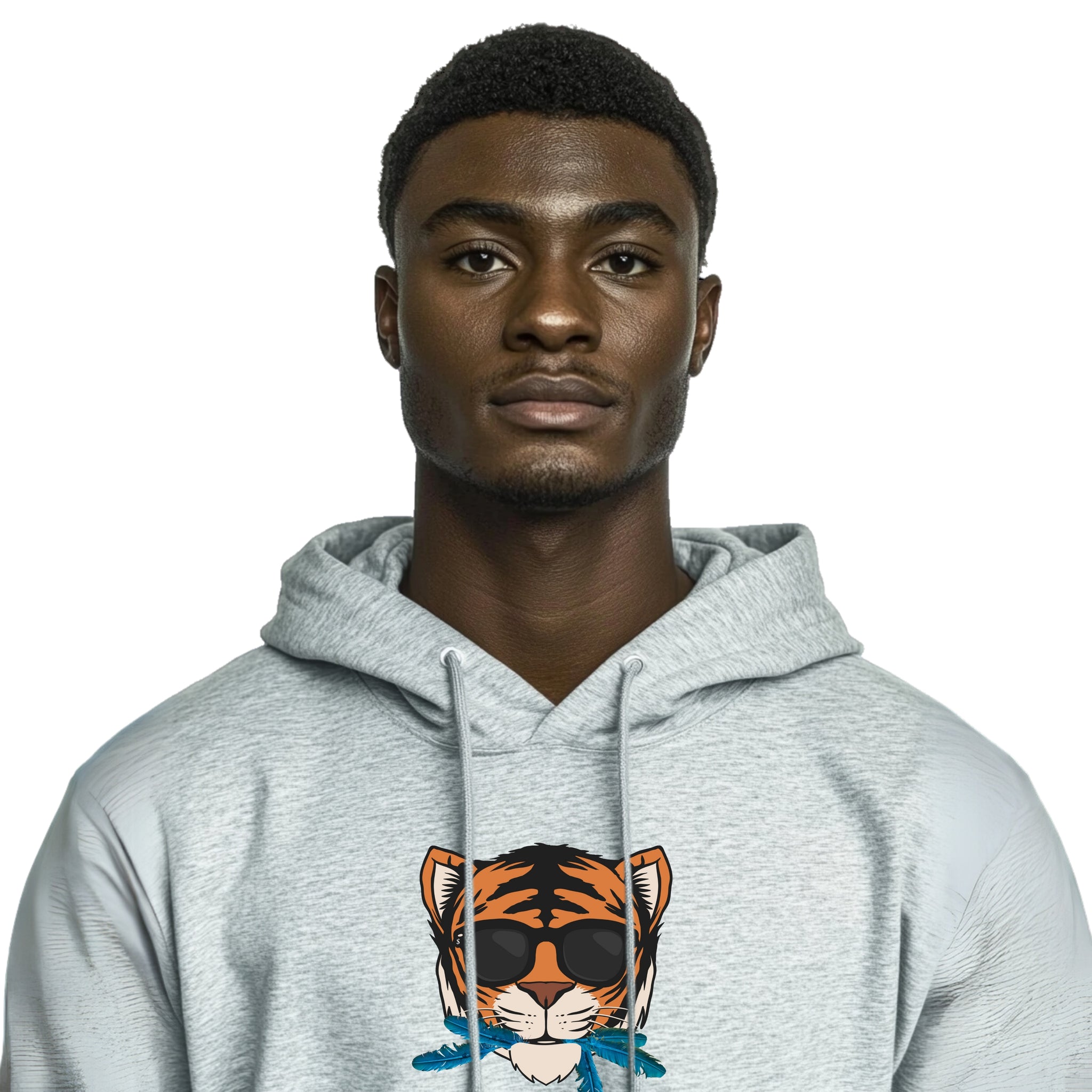 Embrace the essence of quiet confidence with the "Cat That Ate the Canary" Hoodie in versatile gray, featuring a striking centered animated tiger’s face adorned with sleek black shades and vibrant blue canary feathers playfully sticking out of its mouth. This eye-catching design powerfully illustrates the phrase "the cat that ate the canary," symbolizing a profound sense of self-satisfaction and assurance. It encapsulates the notion that true success often speaks for itself, even when one doesn’t feel the need to boast.